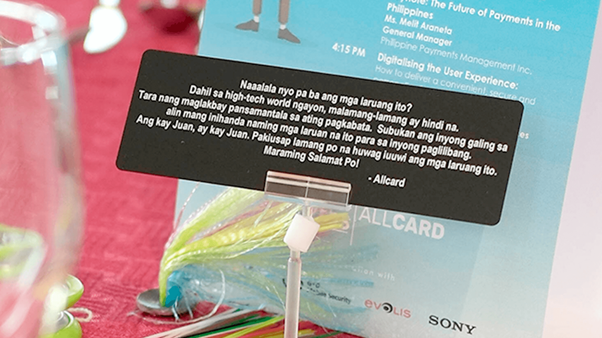 The event’s motif revolved around the Modern Filipino. Allcard prepared traditional toys for the guests to enjoy and revisit their Pinoy childhood days. These toys included trumpo, plastic balloons, pick-up sticks, jackstones, and yo-yo to name a few. To encourage and let the guests know that they can freely play with the traditional toys, Allcard worked with an economical and bright idea: print the note card using the efficient and multi-purpose Evolis Price Tag Solution.